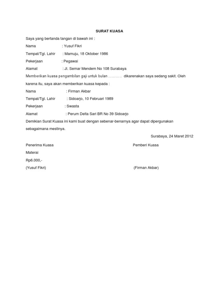 Mulai dari contoh surat kuasa pengambilan bpkb, pengambilan ijazah, pengambilan uang, dan masih banyak lainnya. Ini adalah beberapa contoh surat kuasa pengambilan gaji yang bisa menjadi referensi anda. Surat kuasa pengambilan risalah lelang : Pengambilan kutipan risalah lelang oleh pembeli yang dikuasakan harus menggunakan surat kuasa notarill, dengan melampirkan identitas diri pemberi dan penerima kuasa dan bukti penyetoran pelunasan bphtb. Hal ini dilakukan karena si pemberi kuasa tidak dapat melakukan suatu.